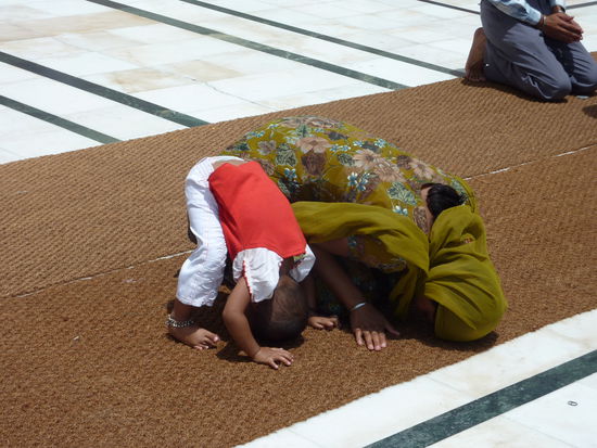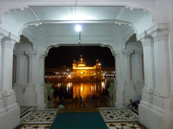 Der Teich ist quadratisch und im Zentrum steht der Tempel. Im Tempel sitzt ne Musikantengruppe und singt den ganzen Tag religioese Lieder, die auch nach draussen uebertragen werden. Die Pilger nehmen ein rituelles Bad und wandern um den Tempel und gehen natuerlich auch rein. Die Atmosphaere ist sehr mystisch!
