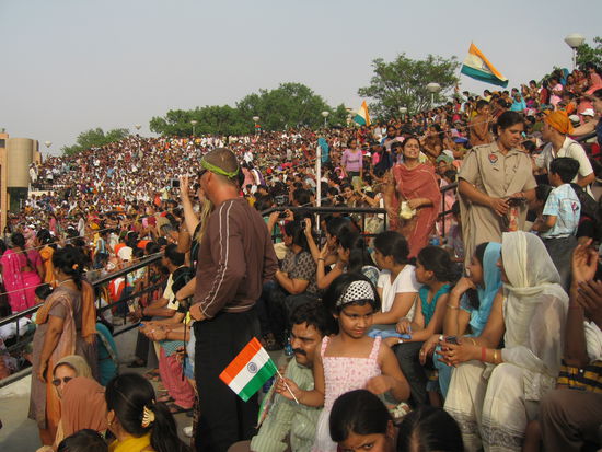 Das Manoever war sehr theatralisch, auf der indischen und pakistanischen Seite wurde das gleiche durchexerziert und das Publikum versuchte sich gegenseitig niederzubruellen.