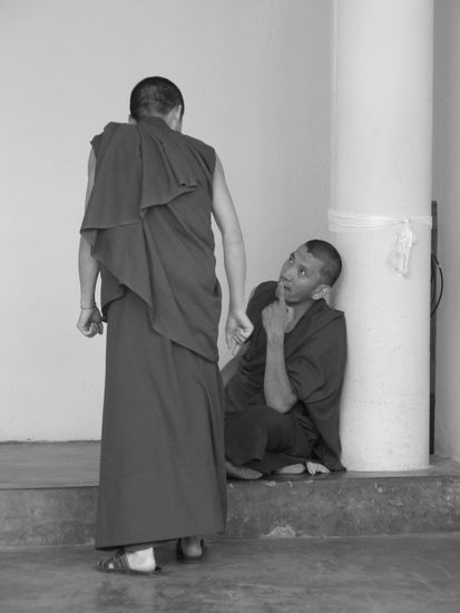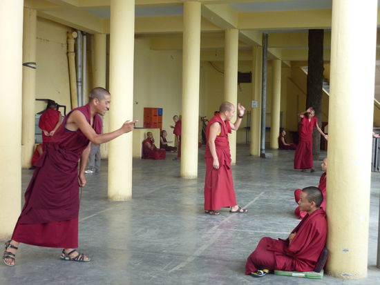 Zunaechst war's im Tempel noch zielmlich ruhig. Gegen abend kamen die Moenche in Scharen an, setzten sich in zweier Grueppchen und debattierten nach traditioneller Art. Einer sitzt, der andere steht und bekraeftigt seine Argumente indem er am Ende in die Haende klatscht.