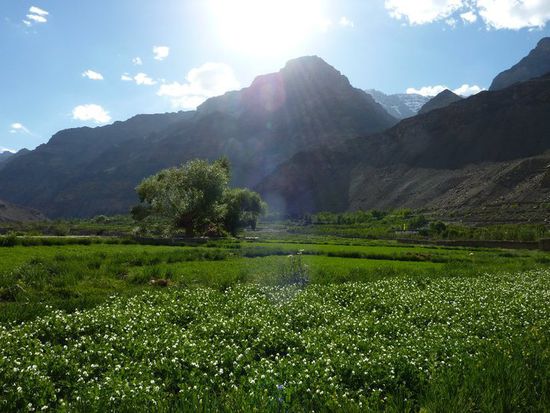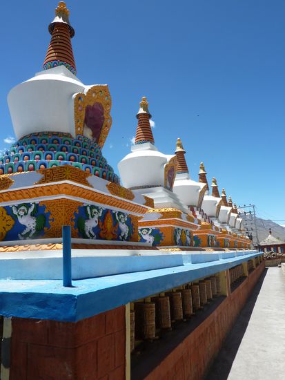 Tabo ist eine der groesseren Siedlungen in Spiti und ist eine Oase zwischen all dem Grau. Das Tal ist hier etwas breiter und das Oertchen liegt malerisch zwischen den Aeckern....