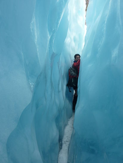 Wir rutschen also durch die Spalten, kriechen in Hoehlen und klettern so steile Eistreppen hoch - man zieht sich eigentlich mehr an den Seilen hoch - und es macht voll Spass.