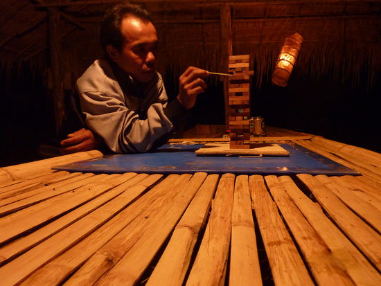 Dort haben die Mahuts gewohnt. Das sind die traditionellen Haeuser in Nordthailand: Bambuswaende und fuer die Daecher werden grosse Blaetter zusammen genaeht.