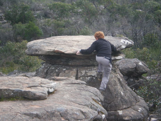 Am Mt. Arapiles gibt es das beruehmte Klettergebiet. Ein riesiger Sandstein mit ueber 2000 Kletterrouten von-bis! Die echten Kletterer sind da am Campground herumgehangen (natuerlich mit ner Muetze auf ). Im Gegensatz zur Kuestenstrasse war es da oben Richtung warm und trocken! Rote Erde und uns ist gleich irgendein grosses Reptil ueber den Weg gelaufen und da ja glaub ich fast alles giftig ist in Australien......... Wir sind dann wieder weitergefahren und gefahren und gefahren und haben nix zum uebernachten gefunden und mussten wieder auf nen Campground. Die Strassen sind die Hoelle hier! Sie sind zwar asphaltiert, aber so holperig und unser Bus hat irgendwie keine Stossdaempfer. Auf jeden Fall wird man ordentlich durchgeschuettelt und man koennte fast nen Travelgum vertragen....