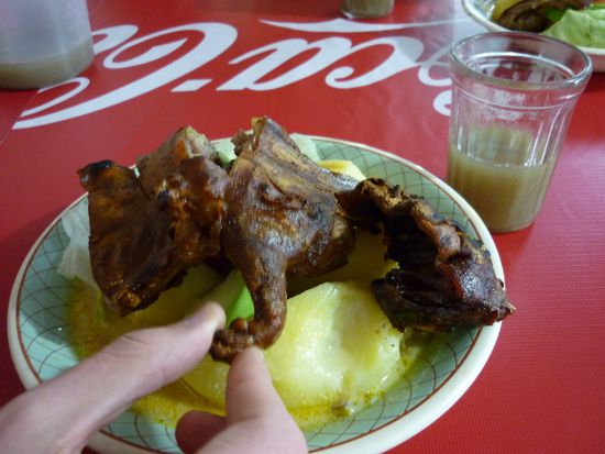 Letzte Woche sind wir "Cuy" essen gegangen. Dazu mussten wir erst mal eine Stunde mit dem Bus aus Quito herausfahren. Gegrillte Meerschweinchen gelten hier in Südamerika (im gesamten Andenhochland) als Spezialität. Auch wenn sie auf dem Rost fürchterlich aussehen habe ich ein Stück davon gegessen. Dazu haben wir das traditionelle Maisbier "Chicha" getrunken. Wenn man in Ecuador war / ist muss man das mal gegessen haben - das gehört einfach dazu. Im Gegensatz zu einem normalen Hausmeerschweinchen können die Cuy eine Körperlänge von 50 cm und ein Gewicht von 4 kg erreichen.
