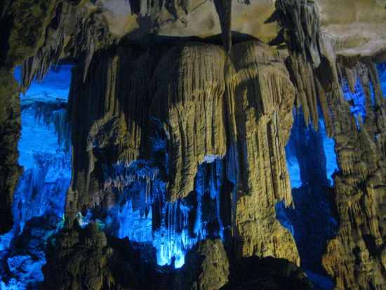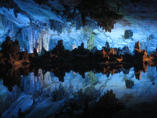In einer der Felsnadeln befindt sich die Reed Flute Höhle. Nachdem wir am ersten richtig sonnigen und warmen Tag etwa eine Stunde von Guilin aus mit dem Rad hierher gebraucht haben ist die Kühle der Höhle eine willkommene Erfrischung. Diese ist eine langgezogene Tropfsteinhöhle mit Unmengen an riesigen Tropfsteinen und einem kleinen unterirdischen See, in welchem sich die Decke der Höhle und die beleuchteten Tropfsteine spiegeln. Wir verbringen fast 2 Stunden in der Höhle ehe wir am Ausgang total vom Sonnenlicht geblendet werden.