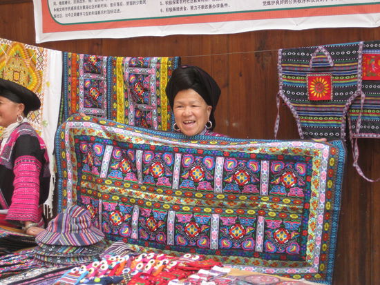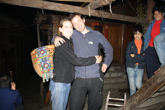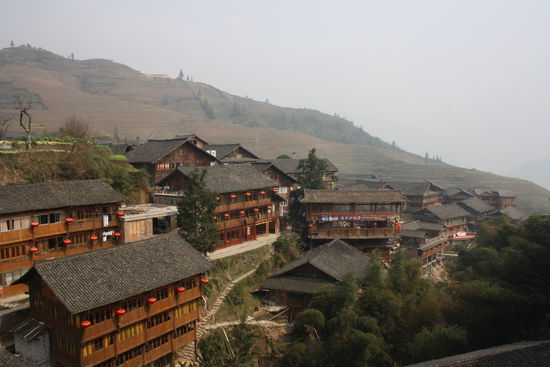 Es ist erst seit 1997 möglich in die Region zu kommen, da vorher noch keine Straße in die Berge existiert hat. Da wir uns für den einfachsten Weg hierher zu kommen entschieden haben, es würde einfach zu lange mit den öffentlichen Verkehrsmitteln hierher dauern, müssen wir anfänglich die totale chinesische Touristenfahrt mitmachen. Zum Glück war es kein Problem das wir über Nacht bleiben wollen und so können wir uns sobald wir die Reisterassen erreicht haben von dem Touristenstrom absetzen. Wir laufen durch die Reisterassen die sich über alle Hänge bis in 1000m Höhe erstrecken. So ganz genau wissen wir dabei nicht wo wir letztendlichh die Nacht verbringen werden, da wir weder eine Karte noch einen Plan haben wie weit es in das nächste Dorf ist. Auf dem Pfad treffen wir auf 2 Longhairfrauen und sie laden uns ein bei Ihnen daheim zu schlafen. So landen wir dann in dem abgelegenen Dorf Zhongliu. Es ist ein altes Bauerndorf der Longhairs und wir verbringen die Nacht in einem der alten großen Holzhäuser. Die Verständigung ist natürlich nicht so einfach, aber mit Händen und Füßen kommen wir doch sehr weit. Es ist auf jeden Fall genial, vollkommen ab von den Touristenströmen, die schon bald auch hierherkommen werden, sie bauen gerade eine Straße, in einem noch nahezu unberührten Dorf zu schlafen und so ein wenig in die Lebensweise dieses Volksstammes einzutauchen. So sind hier die Frauen schon immer die Chefs und die Männer haben sich um das Haus und die Kinder zu kümmern. Am nächsten Morgen setzen wir dann unseren Weg durch die Berge und Reisterassen fort und kommen schliesslich in Daizhu an. Schon von weiten können wir den gravierenden Unterschied zwischen den Dörfern erkennen. Hier gibt es schon jede Menge Hotels und Restaurants. Man sind wir froh das wir auf halben Weg Stop gemacht haben und uns die netten Frauen eingeladen haben.