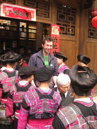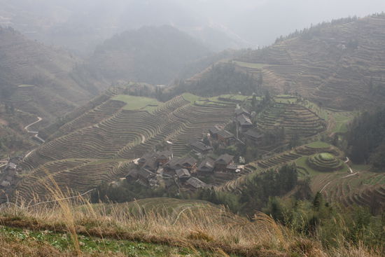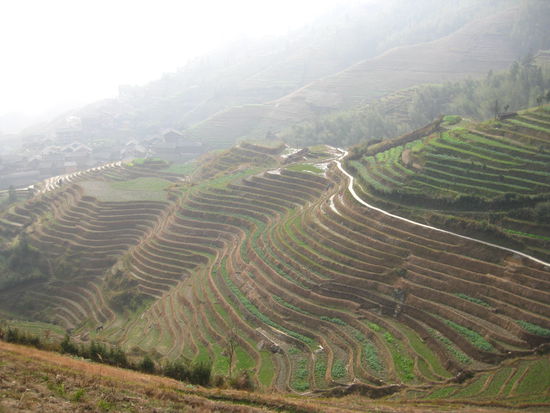 Von Guilin aus fahren wir in die Berge im Norden Guangxis um dort 2 Tage zwischen den Dragon's Backbone Reisterassen herumzulaufen. Wir brechen zu diesem Trip mit Pavel, einem Tschechen den wir im Zug nach Guilin kennengelernt haben, auf. In den Bergen lebt eine Minderheitengruppe, die Longhair People, noch teilweise sehr zurückgezogen in den Dörfern. Die Frauen der Longhair People haben auch durch ihr teilweise bis zu 2m langes schwarzes Haar dem Volksstamm den Namen eingebracht. Sie schneiden ihr Haar niemals ab und tragen selbst im hohen Alter ihre Haarpracht ähnlich wie ein Turban um den Kopf gewickelt.