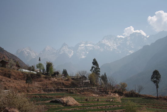 Nachdem wir uns erstmal von dem anstrengendem Anstieg ausgeruht haben, geht es dann auch schon gleich wieder ein gutes Stück nach unten. Jetzt beginnt der leichte Teil des Treks, aber dafür auch der Spektakulärste. Die schneebedeckten Berge auf der anderen Seite sind zum greifen nahe und in der Nachmittagssonne ist es ein wahres Farbenspiel was wir beim wandern beobachten können. Als wir dann am späten Nachmittag bei einer Unterkunft ankommen entscheiden wir das es für Heute genug ist und so verbringen wir einen entspannten Abend in der Schlucht. Allein schon die Toiletten sind der Hammer. Das sind wahrscheinlich die Toiletten mit der besten Aussicht der Welt. Zur steilen Hangseite haben sie keine Mauer und so kann man jeder Zeit die Aussicht auf die Schlucht und die schneebedeckten Gipfel geniessen.