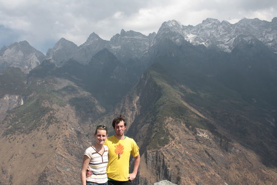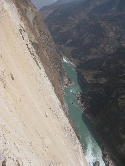 Nachdem wir das Dorf passiert haben geht es in die Vollen. In der mittlerweile starken und gnadenlos auf uns herabscheinenden Sonne geht es in engen Serpentinen nur noch die nahezu senkrechte Steilwand nach oben. Jeder Baum bzw. Strauch der uns mit seltenem Schatten verwöhnt wird von uns Vieren dankbar angenommen. Als wir dann endlich die höchtse Stelle auf 2650m erreicht haben ist die Aussicht einfach atemraubend. Wir stehen auf einem Kliff und über 1000m senkrecht unter uns können wir den turkisblauen Yangtse sehen und immer noch hören.