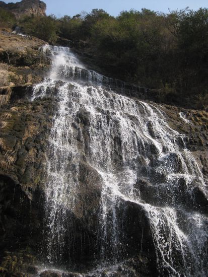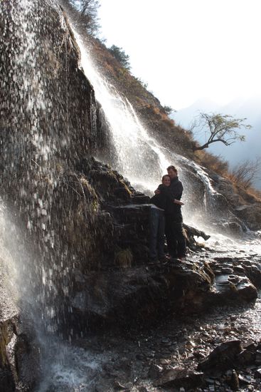Am nächsten Morgen starten wir zeitig um nicht wieder in der größten Mittagshitze herumlaufen zu müssen. Obwohl es nur noch ein kurzes Stück Weg ist, ist es um so eindrücklicher. Wir laufen auf Überhängen auf den Klippen entlang und dabei müssen wir auch noch einen kalten Wasserfall durchqueren. Gestern hätten wir uns sofort unter ihm gestellt und uns die Erfrischung auf keinen Fall entgehen lassen. Leider ist es heute noch zu früh und die Sonne ist erst seit wenigen Minuten über den Bergen hervorgekommen und so verspührt keiner wirklich Lust sich unter das Eiswasser zu stellen.