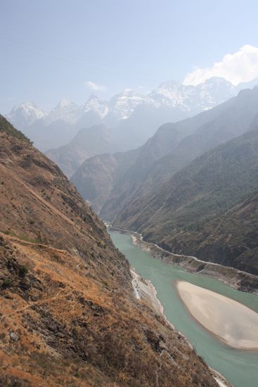 Zwischen Lijiang und Shangri La liegt die 2. tiefste Schlucht der Welt, die Tiger Leaping Schlucht. Diese gigantische Schlucht hat uns dann nochmal zum Yangtse geführt. Hier ist er aber noch sehr schmal und wild und wird auf beiden Seiten von teilweise über 2000m hohen Steilwänden zwischen die 2 über 5500m hohen Gerbirgsketten gequetscht.