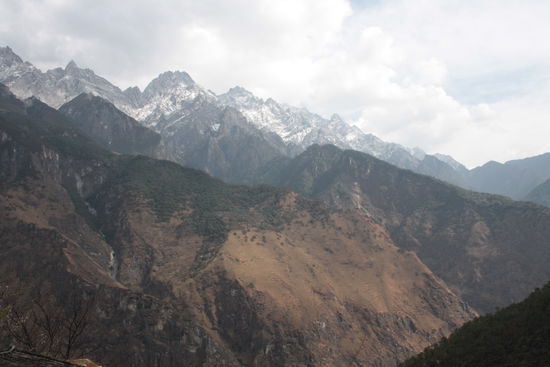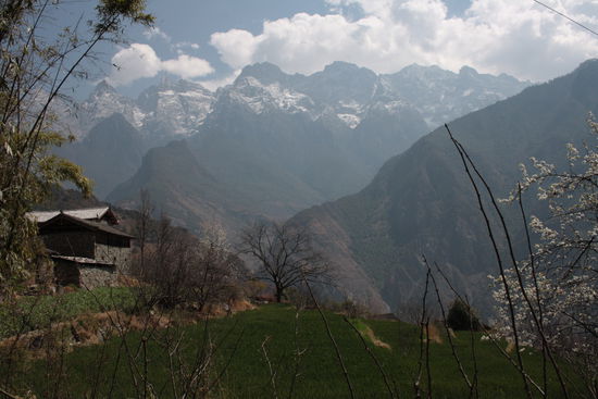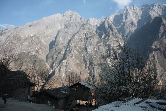 Der Beginn ist dann auch gleich recht steil und wir müssen noch auf einer geteerten Straße die ersten paar hundert Höhenmeter überwinden. Die Tiger Leaping Schlucht ist hier allerdings noch recht breit und so ist es eigentlich erst der Einstieg in die wahre Schlucht. Nachdem wir den ertsen Anstieg hinter uns gebracht haben ist erst mal Zeit etwas zu verschnaufen. Wir laufen nun auf einem staubigen Eselspfad mehr oder weniger waagrecht an der Steilwand entlang und passieren dabei auch das erste der 3 in der Schlucht liegenden kleinen Siedlungen. Diese krallen sich geradezu an die Steilwände und jeder Quadratzentimeter des ausnamsweise nicht ganz so steilen Geländes um die Siedlungen herum ist in Terrrasenfelder umgewandelt worden. Tief unter uns ist das Grollen des Yangtse ein ständiger Begleiter.