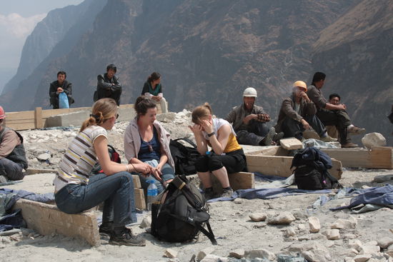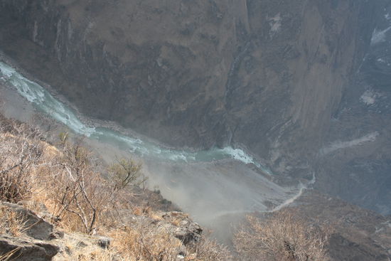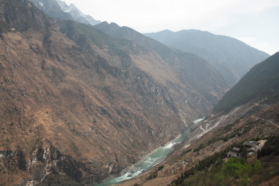 Der Weg geht stetig in Richtung des Flusses und so sind wir dann auch schon nach nicht mal 2 Stunden am Ende der Schlucht angekommen. Wir sind dort zwatr immer noch gute 500m über dem Yangtse aber wir entscheiden ums nicht bis zu ihm hinuter zu steigen. Der Abstieg und der Aufstieg soll an die 4 Stunden dauern udn da wir noch heute direkt weieter nbach Shangri- La wollen lassen wir es bleiben und machen uns auf den Weg zurück zum Anfang. Das nimmt dann auch noch genug Zeit in Anspruch, vorallem weil sie gerade dabei sind die alte schmale Straße zu verbreitern. Es ist eine einzige Staubpiste und an einer Stelle ist ein riesiger Steinrutsch den wir erst zu Fuß überqueren können als die Bauarbeiter Mittagspause machen.