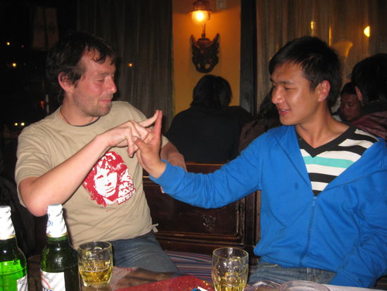 Zum Glück lernen wir am Nachmittag des selben Tages zwei total nette Typen aus Shangri La kennen und verbringen dann wenigsten noch einen absolut genialen Nachmittag. Nachdem wir einen der beiden zu seiner Arbeit gebracht haben machen wir mit dem anderen, einem tibetianischen Sänger, einen Ausflug zu einer nahegelegenen Moorlandschaft. Dort beobachten wir jede Meng an Vögeln und anderer Tiere. Als wir zurück in Shangri-La sind werden wir noch von ihm zu sich nach Hause eingeladen. Dort werden wir in dem alten Haus nach typisch tibetianischer Sitte willkommen geheissen und verbringen den Nachmittag bei Tee und Gesang. Er zeigt all seine Musikinstrumente und speilt und singt jede Menge tibetianischer Songs. Das war echt ein super toller Nachmittag.