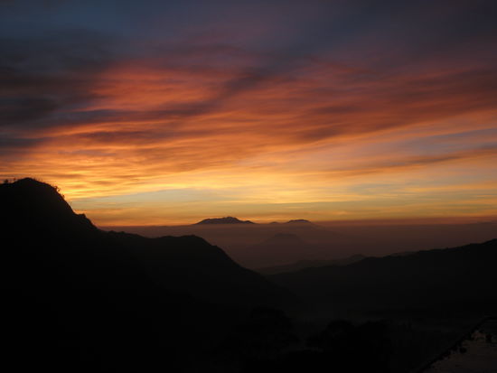 Um 3 Uhr haut uns der Wecker dann auch schon nach 5 Stunden Schlaf aus den Federn und wir machen uns bei Vollmond auf den Weg in Richtung eines Aussichtspunktes inmitten einer der meherern hundert Meter hohen Steilwände des Tengger Kraters. Zum Glück spendet der Vollmond uns sein silbriges Licht, denn ansonsten wäre der steile Anstieg doch um einiges riskanter gewesen als er es auf dem rutschigen Untergrund eh schon war. Nachdem wir etwa eine Stunde durch die vom Tau total nassen Gräser, Farne und Büsche nach oben geklettert sind erreichen wir noch im Dunkeln den Aussichtspunkt auf etwa 2700m Höhe. Der Sonnenaufgang über dem weit entfernten Kawah Ijen ist der Auftakt au einem wahren Spektakel. Wir stehen Staunend weit über dem Krater und geniesen dieses Naturschauspiel. Leider steigt der Nebel immer weiter nach oben und als wir den Krater des Bromo nicht mehr sehen können machen wir uns auf den Weg hinab.