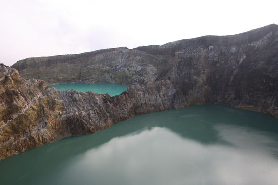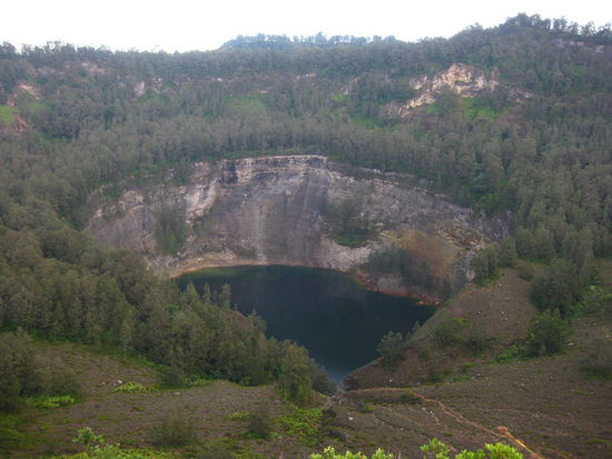 Das einzigartige am Kelimutu sind aber seine 3 verschiedenfarbigen Seen die alle nur durch Steilwände voneinander getrennt sind. Das fazinierende an den Seen ist das sie je nach Jahreszeit Ihre Farbe wechseln und niemand kann sich bis jetzt einen Reim darauf machen. Wir erleben die 3 Seen in grün, in schwarz und in einem total tiefen Turkis. Eine echte Augenweide. Wir würden gerne länger auf dem Gipfel bleiben aber es ziehen schwarze Wolken auf und es beginnt leicht zu regen und so beschliessen wir uns an den Abstieg zu machen. Dieser stellt sich dann als viel anstrengender heraus als der Aufstieg. Zumindest kommt es uns allen so vor.