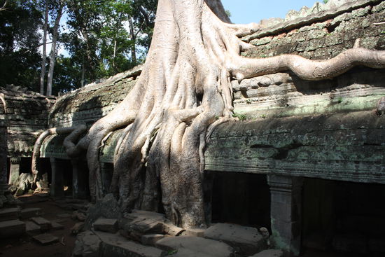 So erreichen wir dann noch einer etwas längeren Fahrt unser nächster Ziel, Ta Prohm. Die Gebäude dieses großen Tempelkomplexes nehmen mehr als 1 Hektar in anspruch. Allerdings sind sie zum Großteil stark verfallen und mit Urwaldriesen überwachsen. Das macht aber gerade den Charme des Ortes aus. Über vielen Gebäuden sind im laufe von hunderten Jahren Urwaldriesen gewachsen und mit ihren riesigen Wurzeln scheinen sie heute den Gebäuden noch mehr Stabilität zu geben. Wir streifen ewig durch die verfallen Gebäude umher und dabei kommen wir uns wie echte Entdecker vor.