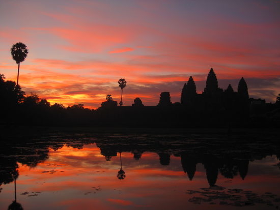 Den zweiten Tag beginnen wir mit einer Fahrt durch die Nacht. Unser Ziel ist abermals Ankor Wat wo wir den Sonnenaufgang betrachten wollen. Wir finden uns an einem kleinen künstlich angelegeten Teich genau vor dem Hauptgebäude zusammen mit vielen anderen ein. Ein wirklich kaum zu vergessender Anblick. In dem Teich spiegelt sich der komplette Bau währendessen der Himmel dahinter in immer wieder neuen Farben den Aufgang der Sonne bejubelt.