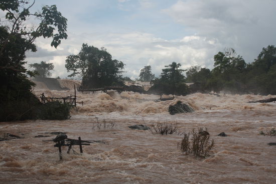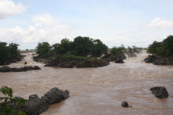 Mit Fahrrädern fahren wir einen Tag über die kleine Insel Don Det und über eine Brücke gelangen wir auch noch auf die Nachbarinsel Don Khong. Diese ist etwas größer, aber auch nicht wirklich groß. Im Süden Don Khongs stehen wir vor den tosenden Wassermassen der Li Phi Fälle. Da wir uns in der Regenzeit befinden und der Mekong stark angeschwollen ist sind sie echt beeindruckend. Angeblich ist das der breiteste Wasserfall der Welt. Wirklich einschätzen können wir das nicht da sie einfach nicht zu überblicken sind.