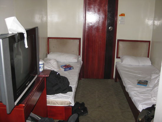 Leider hat es der Wettergott nicht all zu gut mit uns gemeint und so sind wir die meiste Zeit bei Nebel , der oft so dicht war das wir nicht mal beide Ufer vom Schiff aus sehen konnten, langsam den Yangtse von Chongqing bis zum 3 Schluchten Damm hinunter gefahren. Das Schiff war auch nicht der Super Luxus Dampfer, sondern eher ein alter rostiger Karren. Wir hatten uns schon sowas in der Art gedacht und darum haben wir uns für eine 1. Klasse Kabine entschieden. Der einzige Unterschied zu den anderen Kabinen bestand nur durch die Anzahl an Betten, wir hatten halt eine 2 Bett Kabine. Kabine ist in diesem Zusammenhang aber ganz schön übertrieben, es war eher eine öffentliche Toilette auf dem Wasser. Zumindest gestunken hat es so. Daher haben wir die ganze Zeit, trotz schlechtem und kaltem Wetter, an Deck verbracht.