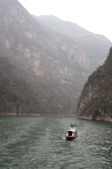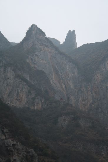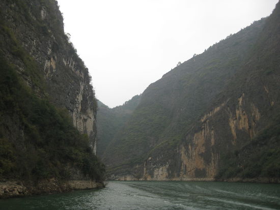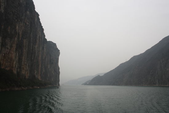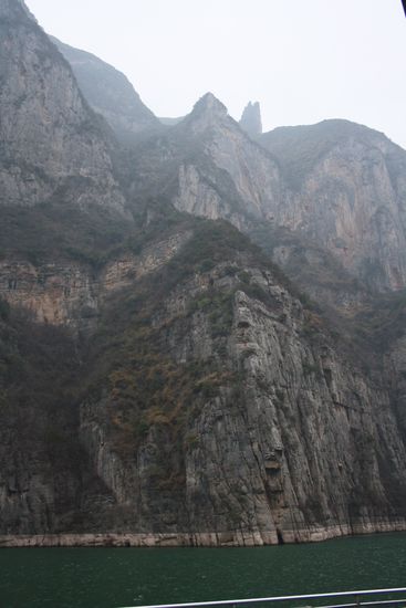 Wieder zurück auf unserem "Super Luxus Dampfer" fahren wir sofort in die Wu, auch Hexen Schlucht genannte, Schlucht. Die Passage der spaktkulärsten der drei Schluchten ist etwas über 40 km lang und zu beiden Seiten erheben sich die zerklüfteten Klippen. Viele der Gipfel auf den Klippen haben in der chinesischen Geschichte eine große Bedeutung. Was einerseits von ihrer Form und andererseits von ihrer enormen Höhe, bis zu 900m hoch, kommt. Leider ist es schon am dämmern und der Nebel wird auch immer dichter so bleiben uns manche Reize dieser imposannten Schlucht im grauen Dunst verborgen.