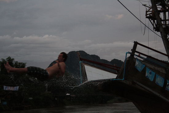 Aber es gibt noch einen ganz anderen Grund warum wir, und viele andere hierher kommen, nämlich um auf den Nam Xong zu tuben. Wir haben uns schon länger auf dieses feucht fröhlige Herumtreiben gefreut. Dazu werden wir etwa 4 Kilometer flußaufwärts gebracht und dann lassen wir uns in LKWschläuchen sitzend einfach den Fluß hinabtreiben. Dabei passieren wir eine Bar neben der nächsten und wie alle anderen auch machen wir an den meisten einen Stop. Neben dem Partytreiben bietet jede Bar entweder auch noch eine Rutsche, ein Hochseiltrapez oder irgend ein anderes Gerät an um die aufgeheizten Leiber auf die spektakulärste Art und Weise wieder abzukühlen. Wir sind mittendrin anstatt nur dabei und so brauchen wir dann auch den ganzen Tag um die 4 km zurück zulegen. Trotz des gigantischem Katers am nächsten Tag hat es jede Menge Spaß gemacht und wenn wir Laos nicht schon verlassen müssten wer weiß ob wir nicht noch ein paar Runden in Vang Vieng tuben würden.......