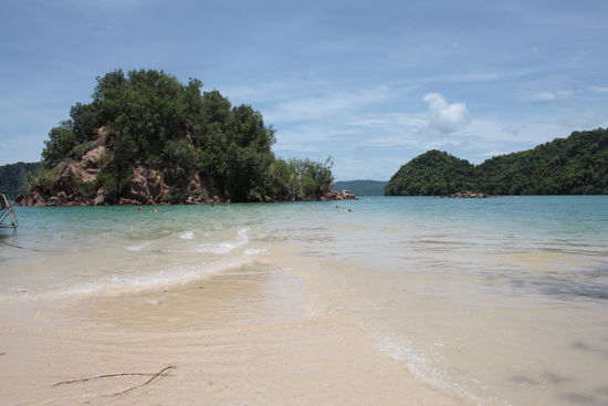 Nach etwa einer Stunde fahrt mit dem Longtail Boot kommen wir dann an einer kleinen Insel an. Dort stoppen wir an einem kleinen weißen Strand. Wir planschen etwas im turkisblauen Wasser und versuchen zu schnorcheln. Leider ist die Sicht wegen der Regenzeit echt bescheiden und so brechen wir das ganze recht schnell wieder ab.