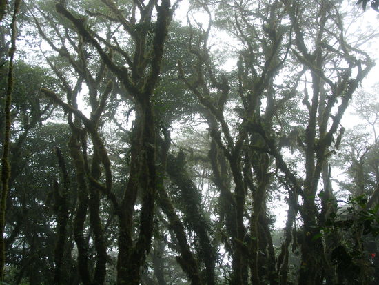 Der Weg führt aus dem Ort raus, nochmal einige Kilometer steil bergauf, auf einer schlammigen Buckelpiste mitten hinein in die Wolken. Als wir die Reserva erreichen müssen wir noch den Eintritt bezahlen und uns eintragen.