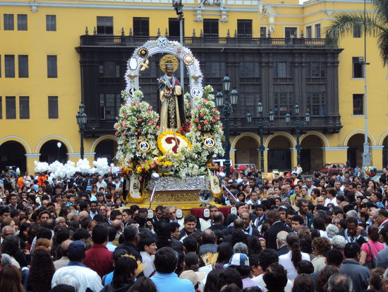 Es ist Sonntag und das ist in Lima nicht zu übersehen. Alle Kirchen werden auf die Prozession vorbereitet. Ich besuche eine im sehr schönen Zentrum von Lima. Dabei sind diese Prozessionen längst nicht so verstaubt wie ich sie mir vorgestellt hatte. Im Gegenteil. Es erinnert mehr an einen Karneval. Neben kirchlicher Musik, höre ich auch Oper, andine Musik, etc. Leute klatschen und auch die Polizei beteiligt sich am Konzert mit Sirenengeheul und Polizeiorchester. Am Schluss der Prozession stehen Soldaten in historischen Uniformen. Ich finde die Prozession toll. Mit etwas Wehmut denke ich dabei an Europa, dass für den wirtschaftlichen Erfolg ihre Traditionen weitgehend aufgegeben oder kommerzialisiert hat. Selbst eine so originelle und gelungene Prozession, so vermute ich, würde bei uns nur wenige Menschen auf die Strassen locken. Als dann die Prozession am ehemaligen Bahnhof endet, ist die Feier längst nicht zu Ende. Ich sehe Jugendliche in bunten Kostümen, wie wenn sie zu einem Theater oder Kostümfestival gehen würden. Die Kirchen bereiten sich auf den Gottesdienst vor, vor ihren Portalen stehen Menschen und Musiker.