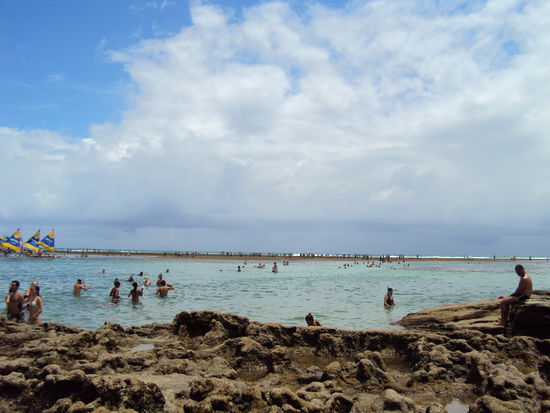 Porto de Galinhas ist ein Traum für alle Schnorchler. Nirgendwo sonst habe ich derart viele Fische gesehen, keine 20 Meter vom Strand weg. Allerdings nur bei Ebbe, sobald die Flut kommt, ist das Wasser trüb. Bei Ebbe gibt es im Riff Pools, in denen die Fische eingesperrt sind. Ich habe drei Pools besucht und sicher über 50 Fischarten entdeckt. Allerdings scheint es für einige Fische zuviel Stress zu sein. Dreimal wurde ich gebissen, einmal ziemlich schmerzhaft in den Rücken. Ich verlasse die Pools und schwimme noch etwas dem Riff, von dem der grösste Teil geschützt und somit abgesperrt ist, entlang, gelbliche Fische scheinen mich eine Weile zu begleiten.