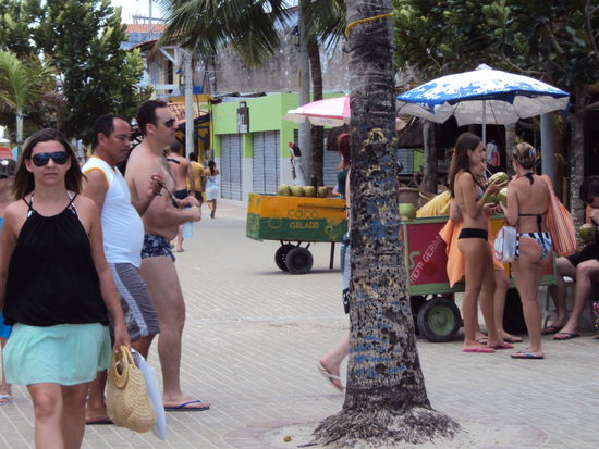 Am Strand sind die Händler: T-Shirts, Sonnenbrillen, Ketten, Krabben, Austern und was weiss ich, was sie alles verkaufen. Alle zwei Minuten kommt so ein Händler und er geht erst, wenn er ein "nao" gehört hat. Und während ich mich nerve, scheinen sich die Brasilianer über jeden Händler zu freuen. Und auch beim fünften T-Shirt Verkäufer, der genau die gleichen Shirts verkauft wie die vorherigen vier, werden alle T-Shirts angesehen. Dass es der Brasilianer liebt, sich beraten zu lassen, stelle ich auch am Abend fest. Die Frauen sind stundenlang in den Kleiderläden, wo sie sich beraten lassen. Am nächsten Tag gehen sie wieder in den genau gleiche Laden und lassen sich wieder beraten. Ich gewinne langsam den Eindruck, dass es die Brasilianer einfach lieben, sich zu unterhalten. Socialising. Eigentlich ein wunderbarer Wesenszug.