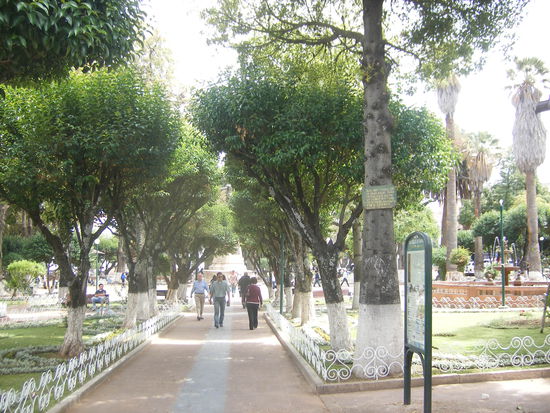 Im Fernseher in meinem Hotel sehe ich eine Wahlkampfveranstaltung. Das ist ja hier in Sucre! Es scheint, dass Tausende Anhänger der Rede des Kandidaten zuhören. Ich gehe sofort zum Plaza de Armas - lediglich einige Dutzend Menschen stehen um den kleinen Podest. So kann das Fernsehen täuschen. Ich sehe eine kreative Demonstration von Schülern gegen die Zerstörung der Umwelt, verliebte Teenager, spielende Kinder mit ihren Eltern und am Abend ist alles auf den Beinen. Ich mag Sucre.