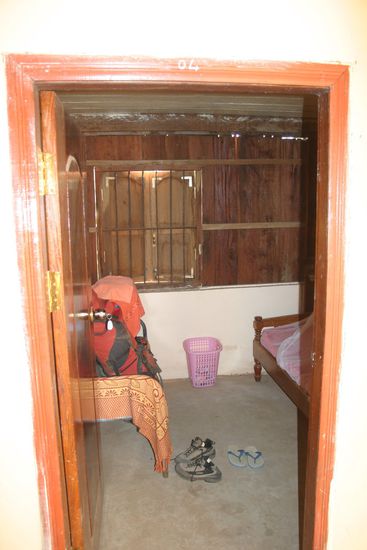 ... endlich angekommen in Koh Nhek, einer Stadt die um eine Kreuzung von 4 Staubigen Strassen gebaut wurde, gibt es erst einmal mittagessen im einzigen Restaurant. Da das eine der2 zur Verfuegung stehenden Guest Haeser bereits vfon der NGO (National Government Organisation) belegt ist wie wir erfahren bleibt nur das ca. 300m entfernte 2. welches aber den gleichen Standart haben soll. Dort eingetroffen wereden die 6 Zellen, eigentlich sollen es ja Zimmer sein, aufgeschlossen und wir duerfen alle begutachten. Ausser einem kleinem Groessenunterschied gibt es allerdings keine unterschiede. Die Zimmer sin mit einem Bett eingerichtet. Wir nehmen also das Groeste und stellen uns eine Bank rein die noch ausserhab steht. Mit den Bettdecken wir diese notduerftig wohnlich eingerichtet und wir koennen wenigsten unsere sachen darauf abstellen. Dann noch das wichtigste, das Moskitonetz aufgehaengt und schon fertig. Die Frage nach Bad und Toilette hatten wir ganz vergessen zu stellen....