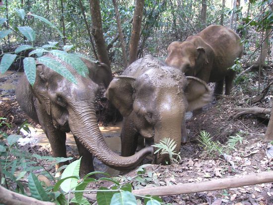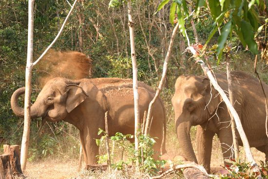 Wir sitzen zum Glueck drinnen und ca 45 min spaeter sind wir angekommen. Mitten im Urwald, Jack begruesst uns freundlich und schon gehts los. Auf dem Plan steht eigentlich den ganzen Tag mit den Elefanten durch den Urwald zu streunen, ihnen beim waschen, fressen und Staub spritzen zuzuschauen. Hier ein paar Eindruecke: