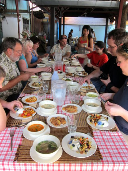 Danach ging es endlich ans kochen. Unter fachmännischer Anleitung kochte jeder der Teilnehmer sieben Gerichte die man aus einer Auswahl zusammenstellen durfte. Es schmeckte köstlich und wir schlugen uns den Bauch voll. Nur meine (Livio) Tom Sab Suppe (eine nordthailändische Spezialität) war ziemlich scharf. Mein Mund brannte, doch ich erfüllte mit meinen drei Chilis noch nicht einmal die Mindestanforderungen eines Thais... Wenigstens war ich besser als andere Teilnehmer mit nur einer Schote: Für die Thais "Decoration"