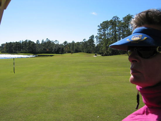Ich habe 14 Löcher gebraucht, um mich daran zu gewöhnen - auch Glen unser Mitspieler hatte seine Probleme damit. Aber mit zunehmender Spieldauer spielte Glen nur noch Hooks (meist ins Wasser) . Meine Drives waren zwar kürzer, aber dafür auf dem Fairway. Am 16. Loch hatten sie jedoch nicht gespart, insgesamt durch 18 (in Worten: achtzehn) Bunker geschützt liegt das Grün etwas erhöht.
