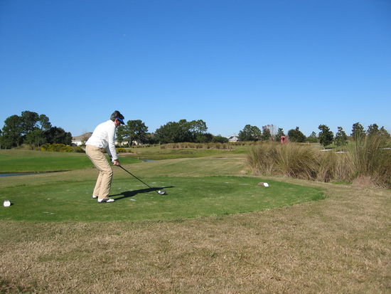 Dem hätte ich auch zugetraut, dass er uns ein 'TagesDu' anbietet. Ich rehabilitiere mich aber mit einem Par am 2. Loch. Im Regelfall bin ich mit meinen Schlägen weiter; Sam scheint nicht gerne zu Putten, meist nimmt er das Pitching dazu, entsprechend schlecht sie seine Putts auch. Er ist Linkshänder und schlägt einen wahnsinnigen Slice. Aber man wundert sich aber dann doch, wenn er 50 cm von der linken Markierung aufzieht, stark nach rechts zielt und der Ball dann links auf dem Fairway landet. Die beiden älteren Herren vor uns trinken inzwischen ihr erstes Bier zu einer guten Zigarre, die der eine nicht einmal aus dem Mund nimmt wenn er abschlägt. Trotz einiger Wartezeiten schaffen wir die Runde mit 4 Stunden. Der Platz liegt im Prinzip rund um einen kleinen Flugplatz, doch wir sind erstaunt, dass uns der 'Fluglärm' nicht stört.