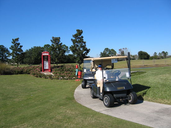 Selbst britische Telefonhäuschen stehen auf den drei 9-Loch-Bahnen rum, von wo man Deli-Order durchgeben kann.