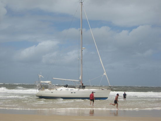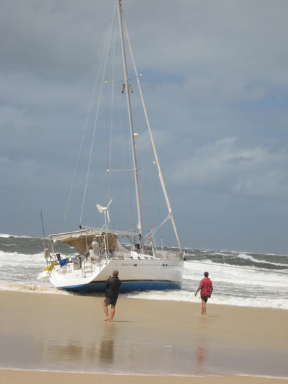 Als uns wieder der Regen drohte machten wir uns auf den Weg zur Faehre. Dabei stiessen wir auf ein gestrandetes Boot. Die Besatzung bestand aus ein paar Maennern welche die naechsten Monate unterwegs See auf sein wollten, weit gekommen waren sie leider nicht. gerade mal eine woche unterwegs. es war aber bereits Hilfe eingetroffen und so konnten wir weiter Richtung Faehre fahren.