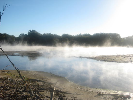 Nach einer weiteren Stunde erreichten wir einen nicht erwaehnenswerten Ort, den Namen hatten wir tatsaechlich nie in erfahrung gebracht wir wissen nur das die Bucht in der er sich befand Mercury Bay heisst. Da der Ort nicht ueberzeugend genug war fuhren wir am naechsten Morgen zu Unmenschlichen Zeiten nach Rotorua. Die Stadt Rotorua selbst befindet sich direkt an der Südküste des nach dem Lake Taupo zweitgrößten Sees auf der Nordinsel, des etwa 80 km² großen Lake Rotorua.