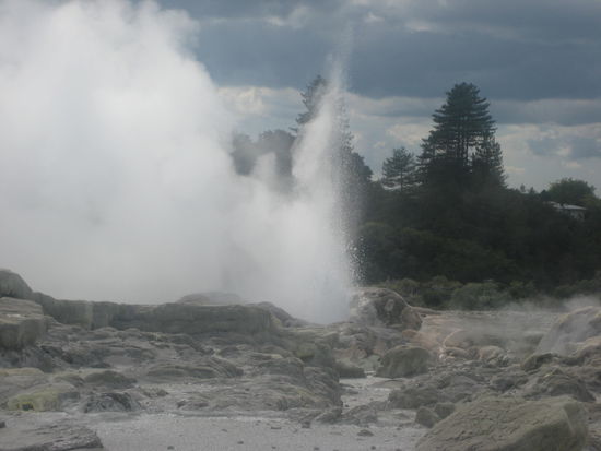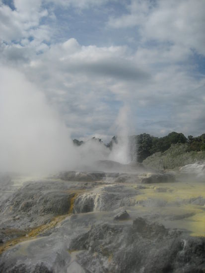 Auch bekannt als Rotten-rua. Der Name ruehrt daher, das in und um die ganze Stadt Schwefel aus der Erde tritt. Der Rotorua-Distrikt liegt in den nördlichen Ausläufern des Zentralen Vulkanplateaus im Zentrum der Nordinsel. Der gesamte Distrikt ist bekannt für seine geothermalen Aktivitäten. Hier gibt es zum Beispiel viele unterschiedliche Geysire, die teilweise bis zu 20 Meter hohe Fontänen heißen Wassers ausstoßen können .Durch die hohe thermale Aktivität werden die meisten Häuser Rotoruas durch Erdwärme geheizt. Außerdem ist ein permanenter Schwefelgeruch typisch für die Stadt. Und zwar so typisch das wir kaum Luft holen konnten!!!