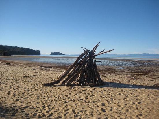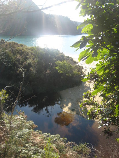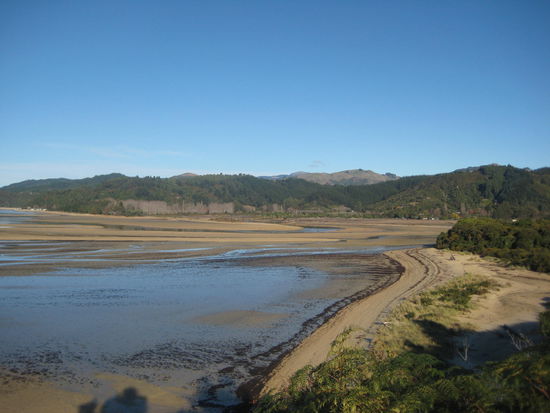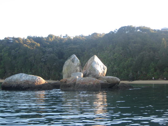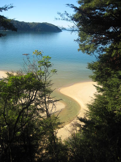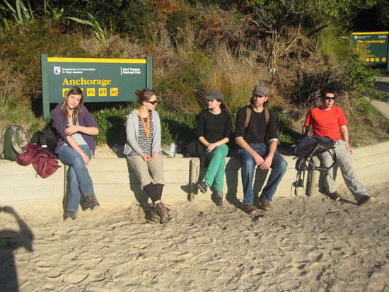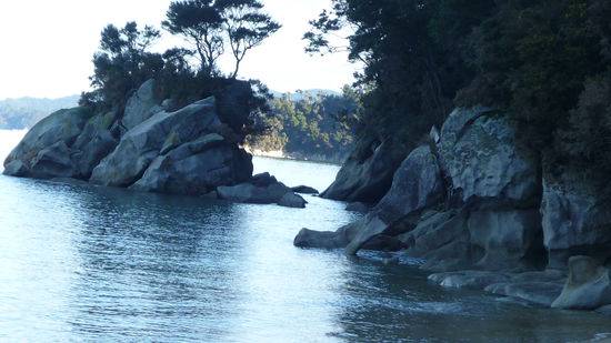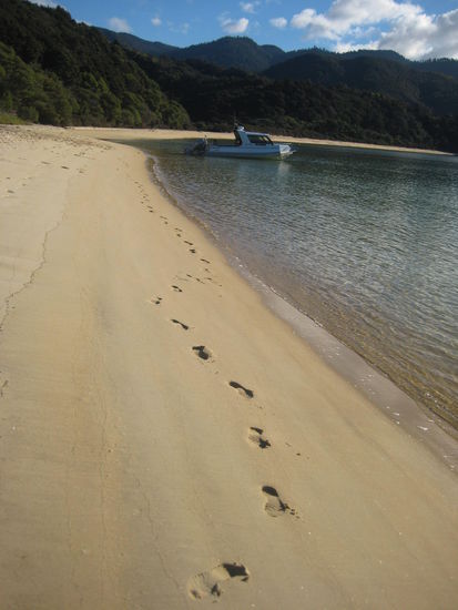 Dieser ging oberhalb vom Meer entlang und so konnten wir ab und zu einen überwältigenden Ausblick auf den vielseitigen Strand erhaschen. Schon hier konnten wir deutliche Unterschiede zur Nordinsel erkennen.Leider blieben die sehnlichst erwarteten Seelöwen, Pinguine, Wasserfälle und Klippen aus. Wir trapten gemütlich durch den Tannenwald und dankten dem Himmel, dass wir uns hatten und uns somit nicht die Langweile um brachte. Nach etlichen Extrawegen zu Lookouts und verschiedenen Buchten freuten wir uns nun auf das Wassertaxi. Bei unserem einstündigen Warten auf des Wassertaxi unterhielten wir uns mit Moni, welche 3 Tage alleine den ATT weiter in den Norden fortführte, "der Himmel sei mit ihr"