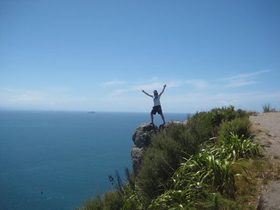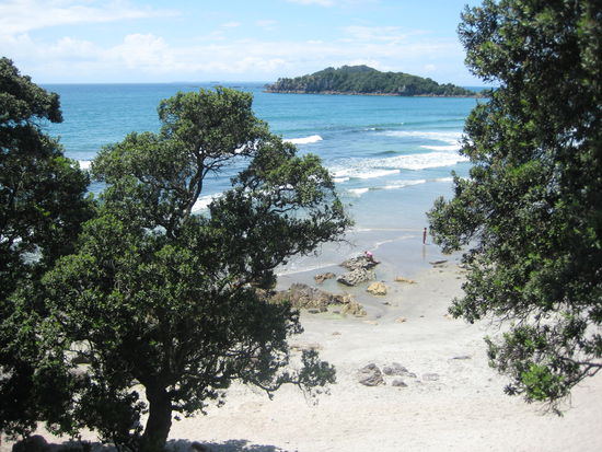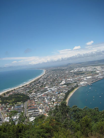 Ich steh auf einem Berg und um mich herum offenes Meer mittendrin eine kleine Insel und der Traumstrand von Maunt Manganui, unglaublich schön!!!