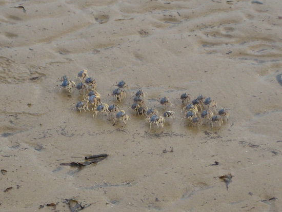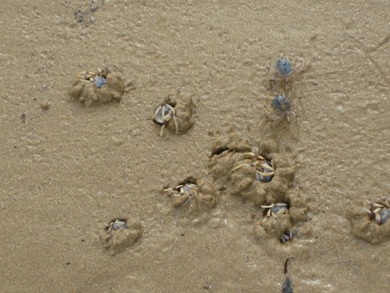Das Wasser war hier nicht so einladend und wir wollten nicht schwimmen gehen. Stattdessen kletterten wir auf dem Lava Gestein herum und schauten uns Quallen, Seeanemonen und Korallen an. Da sahen wir sie !!!! Ganz klein und zu tausenden kleinen Armeen. Und als wir näher an sie heran traten waren sie blitzschnell im Sand verbuddelt. Es dauerte aber nicht lange und an einer anderen Stelle marschierten wieder ein paar hundert im Trupp. Ihre Beine waren ganz hellweiss und sie trugen einen blauen Helm als Körper, deshalb nennt man sie auch die solitär krebse. Sie laufen immer in Gruppen und wenn Gefahr droht vergrabben sie sich superschnell im Sand. Wir beschäftigten uns damit, sie eine ganze Weile zu beobachten. Anschließend