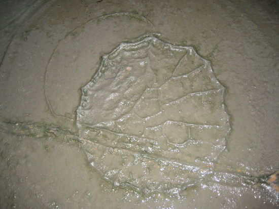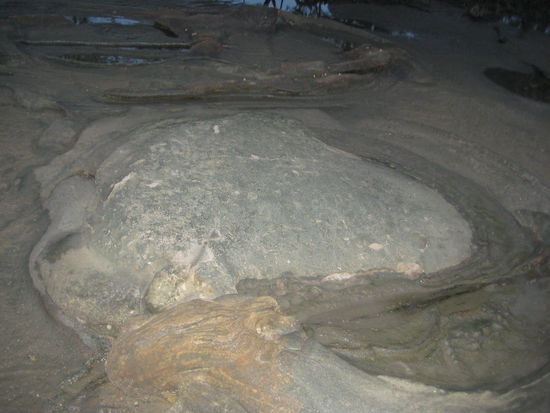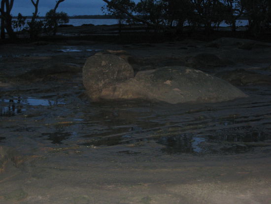 Nachdem der Stachel entfernt und die Sonnenbrille wieder gefunden war machten wir uns auf den Weg nach Deseption Bay in den MangrovenWald bei Fritz um die Ecke und Stephan zeigte mir hier zwischen den dichtgewachsenen Mangroven die durch das Wasser verformten Steine. Wir hatten Glück, das gerade Ebbe war und wir zogen unsere Schuhe aus um über den schlammigen Boden laufen zu können. Da der Boden ziemlich dunkelgrau, matschig und voll mit Krebsen, kaputten Muscheln und Spitzen von Mangroven Sprossen war, behielt ich meine Schuhe an. Ich merkte schnell das dass eine blöde Idee war und Stephan recht hatte, als er meinte: "zieh die lieber mal aus!" Ich steckte im Schlamm fest! Und als ich versuchte meine Füße aus dem kalten Schlamm zu ziehen riss mein einer neuer Flip Flop. Ich hatte mir erst neue gekauft da Susi, der Hund von Greg und Danny, schon am ersten Tag darauf rum kaute und sie kaputt biss. Ich stellte die Flippis weg und ging barfuß Hand in Hand mit Stephan durch den Schlamm. Wenn man sich erst einmal an das glitschige, glibberige, kalte Gefühl und an den Gedanken auf kleinen Krebsen und eventuellen Bodenwürmern unter den Füssen gewöhnt hat, ist es sogar ganz witzig wie ein kleines Kind durch den Matsch zu laufen und sich darüber zu freuen wenn der andere ausrutscht und sich weh tut. Als wir den Mangroven näher kamen mussten wir auf den Sprossen laufen. Das sind kleine Wurzelspitzen die aus dem Boden kommen und sich beim darüber Laufen zwischen die Zehen stecken und auf die Fußsohle drücken, man könnte sagen, das war ziemlich kitzelig. Zwischen den Bäumen war es unheimlich, hier wohnten Schlangen und dicke Kröten und als ich die, durch Wasser eingespülten, Muster auf den Steinen am Boden unter mir sah, war das, so glaubte ich, nicht mehr von dieser Welt. Die Menschen gaben diesen Phänomenen verschiedene Namen. So sah zum Beispiel ein Stein Muster aus wie eine riesige Schildkröte und ein anderes wie eine Mondlandschaft.