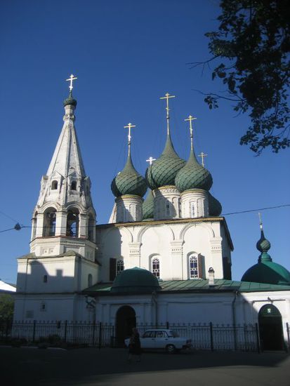 Von Wologda aus führt uns eine gut ausgebaute Landstraße nach Jaroslawl. Dort sind wir schon auf der Suche nach einem passenden Stellplatz durch die halbe Stadt gefahren. Gleichzeitig haben wir natürlich auch die diversen schönen Denkmäler schon beim Vorbeifahren gesehen. Und dank des wie immer ausgefeilten Einbahnstraßen- und Nicht-abbiegen-dürfen-Systems auch gleich mehrfach. Auch hier fällt wieder auf dass die Stadt überall herausgeputzt wird und viele Denkmäler gerade einen frischen Anstrich erhalten. Schließlich findet dieses Jahr hier auch schon die 1000 Jahr Feier statt. Die freundliche Miliz kann uns diesmal leider nicht mit einem passenden Stellplatz weiterhelfen und auch die laut Reiseführer zahlreich vorhandenen Hotels zeigen sich nicht. Also parken wir unser Mobil an einem Park (wie im Nachhinein festgestellt zwischen Christi-Verklärungs-Kloster und Christi-Verklärungs-Stadtkirche) und ich versuche auf meinem Stadtrundgang herauszufinden, ob wir denn nun dort stehen dürfen oder nicht. Letztendlich meinen die netten Bauarbeiter der nahegelegenen Stadtkirche, dass wir ohne Schwierigkeiten am Straßenrand stehen dürfen. Und so bleiben wir. Auf eine Beschreibung der zahlreichen Sehenswürdigkeiten verzichte ich mal an dieser Stelle, denn dies kann jeder Reiseführer sicherlich besser als ich (z. B. nachzulesen in Russland - Europäischer Teil). Während meiner Sehenswürdigkeitenbesichtigungstour (tolles Wort!) besichtigt Jens die Vergnügungsinsel, die sich genau gegenüber unseres Stellplatzes über eine Fussgängerbrücke auftut. Dort verbringen scheinbar verliebte und junge Familien mit Karusselfahren, Biertrinken und Maschinengewehr schiessen ihren Nachmittag. Nachdem ich Jens da wieder eingesammelt habe, schlendern wir noch weiter durch den normalen Ort und sind erstaunt, wie viel hier los ist und dass ohne die erwarteten zahlreichen Touristen. Vermutlich ist noch nicht die passende Jahreszeit. Die einzigen Reisebusse, die ich sehe, bringen entweder die Marktbeschicker wieder nach Hause oder aber dienen als Transportmittel der nahen Kaserne. Im Sonnenuntergang leuchten mal wieder die diversen vergoldeten Kuppeln der umliegenden Kirchen, besonders schön die Nikolaj-Rubljonij-Kirche. Und so genießen wir den Abschluss des Abends bei einem hervorragenden Grillhähnchen von "Grill Donald" (hier scheinen die Namensrechte noch nicht ganz so wichtig und ausserdem stehts da ja auch auf Latein und nicht wie bei Мак Доналдс auf Kyrrilisch).