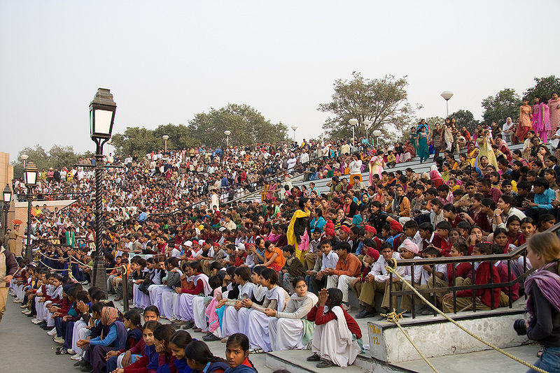 Allabendlich findet der kleine Grenzwettstreit statt: Welche Seite hat mehr Zuschauer, welche jubelt lauter? Großes Gejohle auf der indischen Seite und "Pakistan Zindabad"-Rufe ein paar Meter weiter auf pakistanischem Boden. Die tägliche Dosis Patriotismus. Eingeimpft in derart theatralischer Manier, dass es schon wieder eine Parodie sein könnte. Eine ausgelassene Stimmung wie bei einem Volksfest - oder bei einem Fußballspiel in einem Stadion.