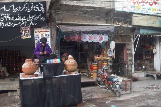 Man spricht die Landessprache Urdu: Wie kommst du denn an SOLCH eine Frau? (Neid!!, grins) Und was wollt ihr mit den beiden Rucksäcken? Nadeem redet und redet. Ich - schon fast im Begriff auszusteigen um dem Typen erst mal meine Meinung zu sagen, brems mich aber noch in letzter Sekunde und denke: ist wohl erst mal besser, still und ruhig sitzen zu bleiben, wer weiß.....Nach langen ca. 10 Minuten mit Passport hin und her wälzen, Palaver, Palaver, Lachen, Nadeem steigt wieder ins Taxi - und zückt sein Portemonnai. Er erklärt mir verschämt, dass der Typ klar gesagt habe, dass er 500 Rs (ca. 4 Euro) haben wolle, dann dürften wir weiter fahren. Ich könnt dem Kalaschnikovbesitzer den Hals umdrehen. Korruption pur, eine Unverschämtheit! Um dieses Spielchen nicht zu wiederholen, trage ich ab sofort im Taxi oder Rikscha einen Schal, bringt mich auch nicht um und man erkennt nicht sofort, dass im Gefährt eine blonde Frau sitzt. Auf der Straße ist dies nicht nötig, Lahore ist überwiegend eine moderne Weltstadt.