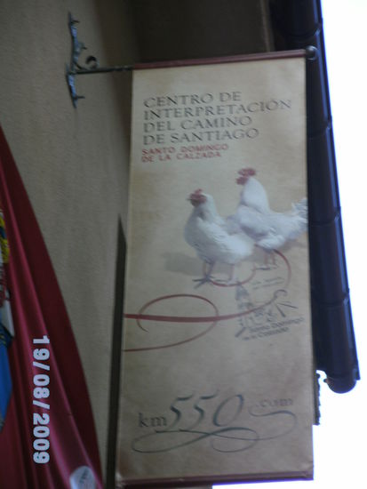 Zur Hochzeit der Wallfahrt nach Santiago de Compostela soll eine Pilgerfamilie aus Xanthen nach Santo Domingo de la Caldaza gekommen sein. Sie übernachteten in einem Wirtshaus. Die Wirtstochter fand den Sohn der Familie sehr attraktiv, der fromm und keusch, ihr Angebot aber zurück wies. Die Zuneigung der Wirtstochter wandelte sich in bösen Zorn, sie sann auf Rache und versteckte einen Silberbecher in seinem Gepäck. Der Wirt bemerkte am Folgetag den Verlust und schickte die Stadtbüttel aus, die auch schnell fanden, was sie suchten. Der junge Mann wurde nach kurzem Prozess aufgehängt und die Eltern zogen traurigen Herzens weiter nach Santiago. Auf dem Rückweg kamen sie wieder an der Richtstadt vorbei, wo sie ihr Sohn ansprach, dass er gar nicht tot sei weil ihn Santo Domingo gehalten hätte. Die Eltern liefen darauf hin zum Richter, der vor einem Teller gebratener Hühner saß, und berichteten das Vorgefallene. Der Richter antwortete, dass ihr Sohn so tot sei wie die Hühner auf seinem Teller, worauf diese sich erhoben und davon flatterten. Nun wurde der Sohn ab und die Wirtstochter aufgehängt, die Familie zog weiter nach hause. Von dieser Zeit an wird ein weißes Paar Hühner in der Kathedrale gehalten, das aller 21 Tage ausgetauscht wird. Es ist auch beschrieben dass das Paar täglich ausgetauscht wird.