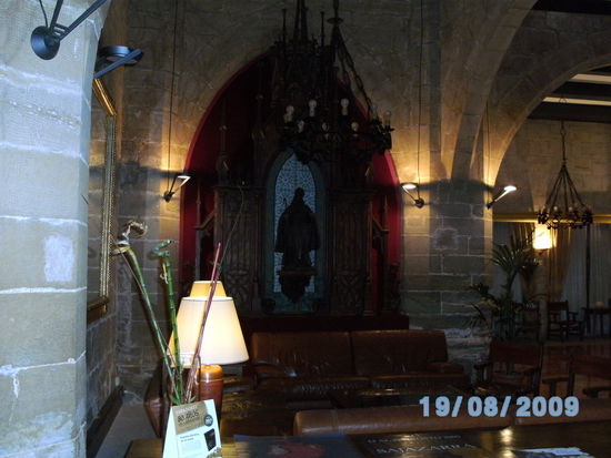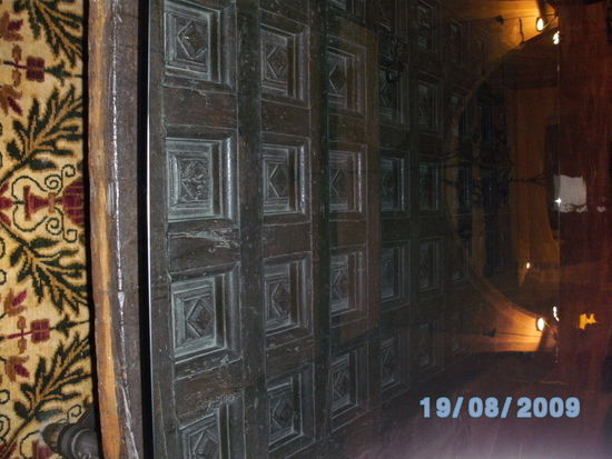 Ich muss noch einmal auf Toilette und gehe in das am Platz gelegene Hotel. Innen ist es wie im Innenhof einer Burg, der Raum hat eine starke Wirkung auf mich, unter Glas liegt eine große schwere Tür, leider ist die Beschriftung dazu nur in spanisch, aber beim Betrachten meiner Fotos zu hause komme ich zu folgendem Schluss: